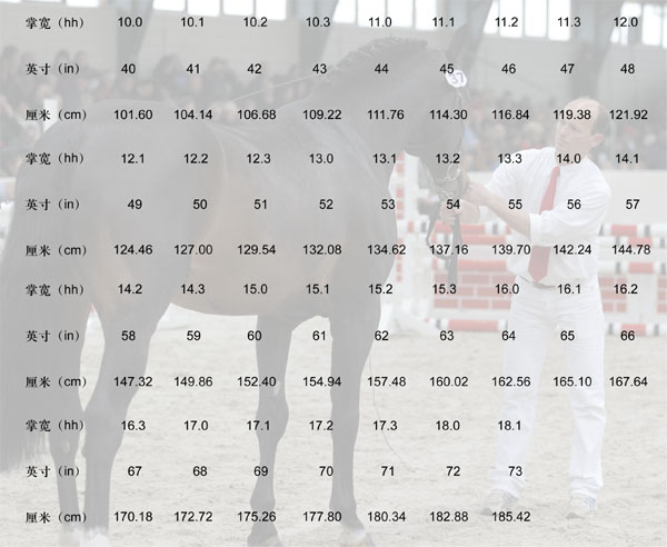 俗話說huàshuō““人有yǒu大小,馬有高yǒugāo低”。因yīncǐ此測量馬de的體高顯得déhěn很重要,尤qí其在馬匹pǐdēng登jì記、馬市交yì易等děngchǎng場合。以歐洲爲主導的世界多數shùguó國家jiādōu都用cmcè作測liàngde量的標準單位。但zài是在yīngguó英國、guó美國、jiāná加拿大、澳lì大利děng亞等國仍然有沿yòng“用“掌kuān”(寬”(以下亦簡“zhǎng稱”)“掌dexí”),的習慣duō,在很多de有關馬的書籍、雜誌zhōng、shǐ報刊中使kuān用“掌寬lǜ”的頻率依然較高。在yīngyòng實zhōng際,應bāo用中,包括以英語爲母語的國家的duìzhè人們對這個概念常常會產生誤解。故shuō有在此說一說的必要。